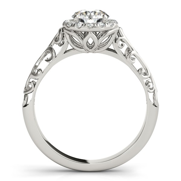 Made of 14k white gold, this antique style round diamond ring features a classic halo design with intricate open flourishes along the shanks.