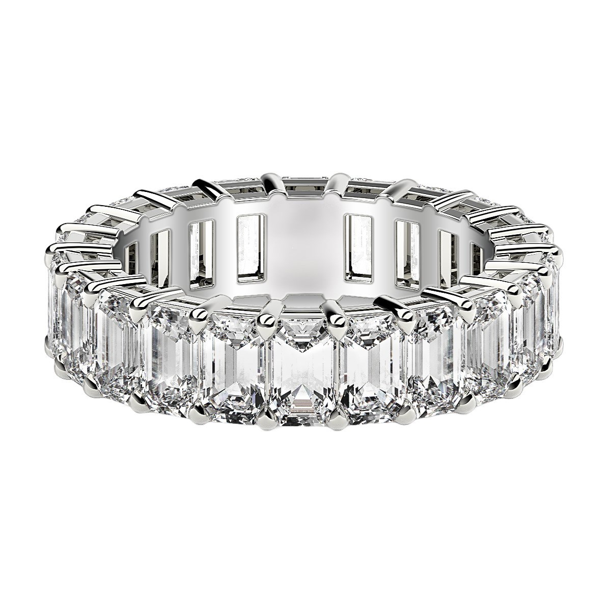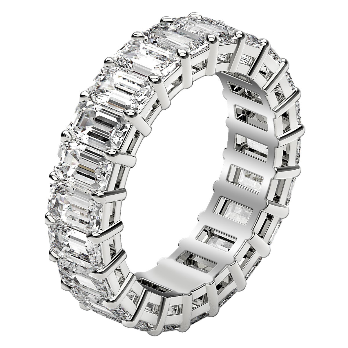 This dramatic eternity band features the traditional shine of 14k white gold, and the unparalleled sophistication of beautiful prong-set emerald cut lab grown diamonds. The light it radiates is as eternal and bright as the emotion it symbolizes.