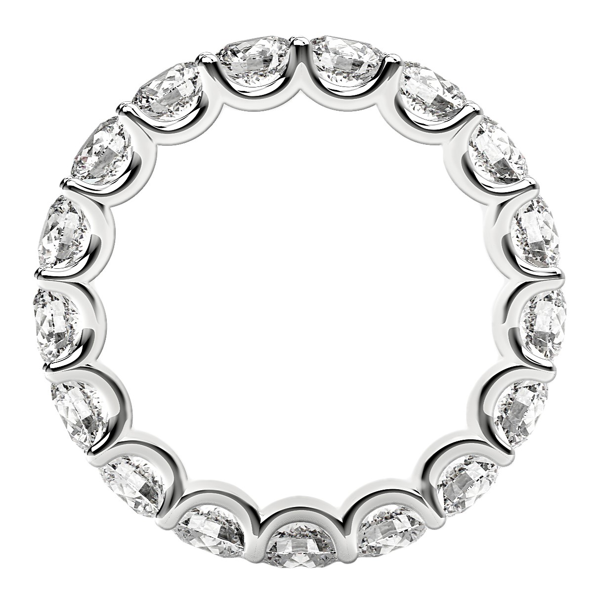 Intriguing curved prongs of glimmering 14k white gold encircle beautiful round cut lab grown diamonds with elegant, arch-like waves of shine in this spectacular eternity ring, adding contrast and organic shape to a traditional setting.